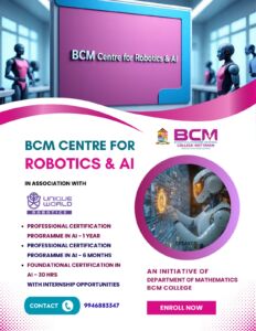 BCM College established the BCM Centre for Robotics and Artificial Intelligence in 2025 to offer workshops, certificate courses, internships, and related programmes for the interested students in Robotics and Artificial Intelligence in collaboration with Unique World Robotics.