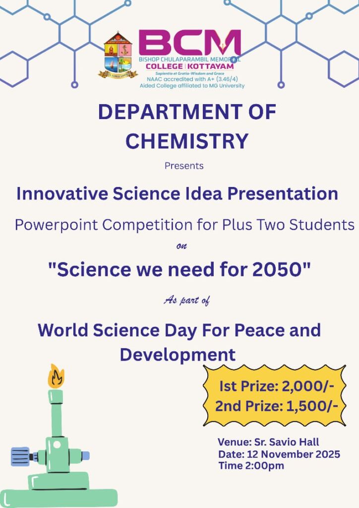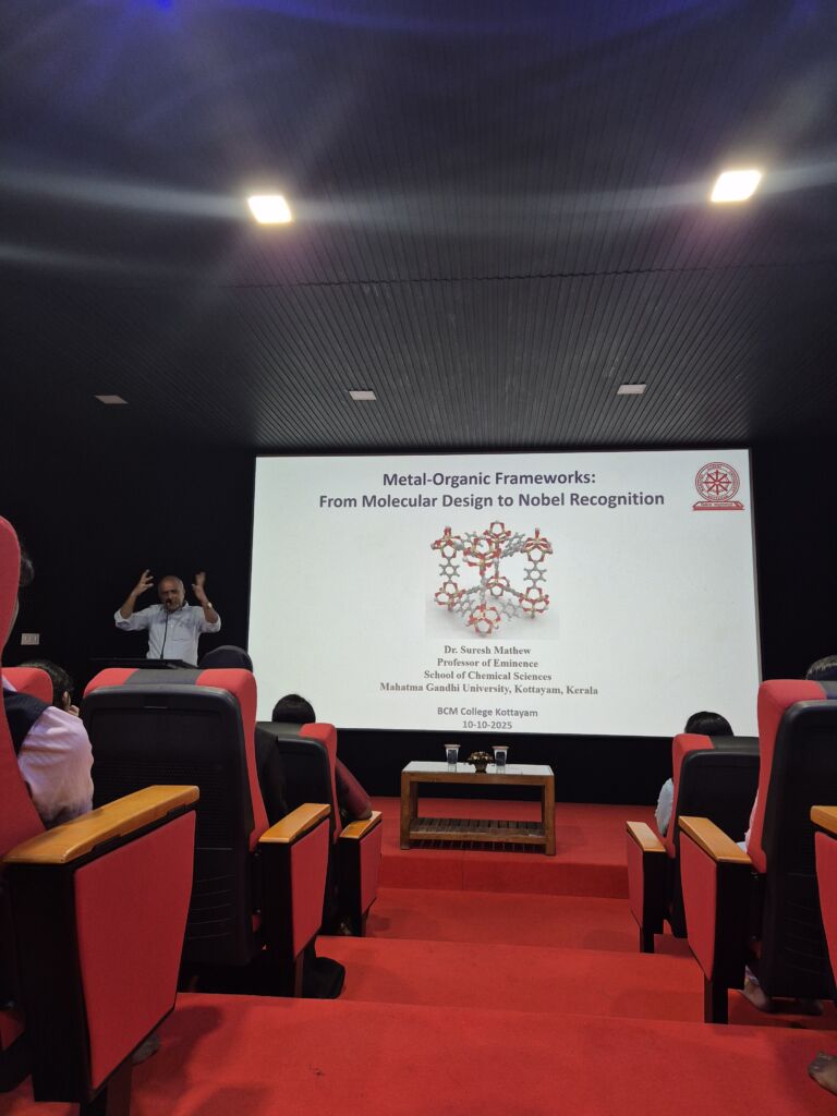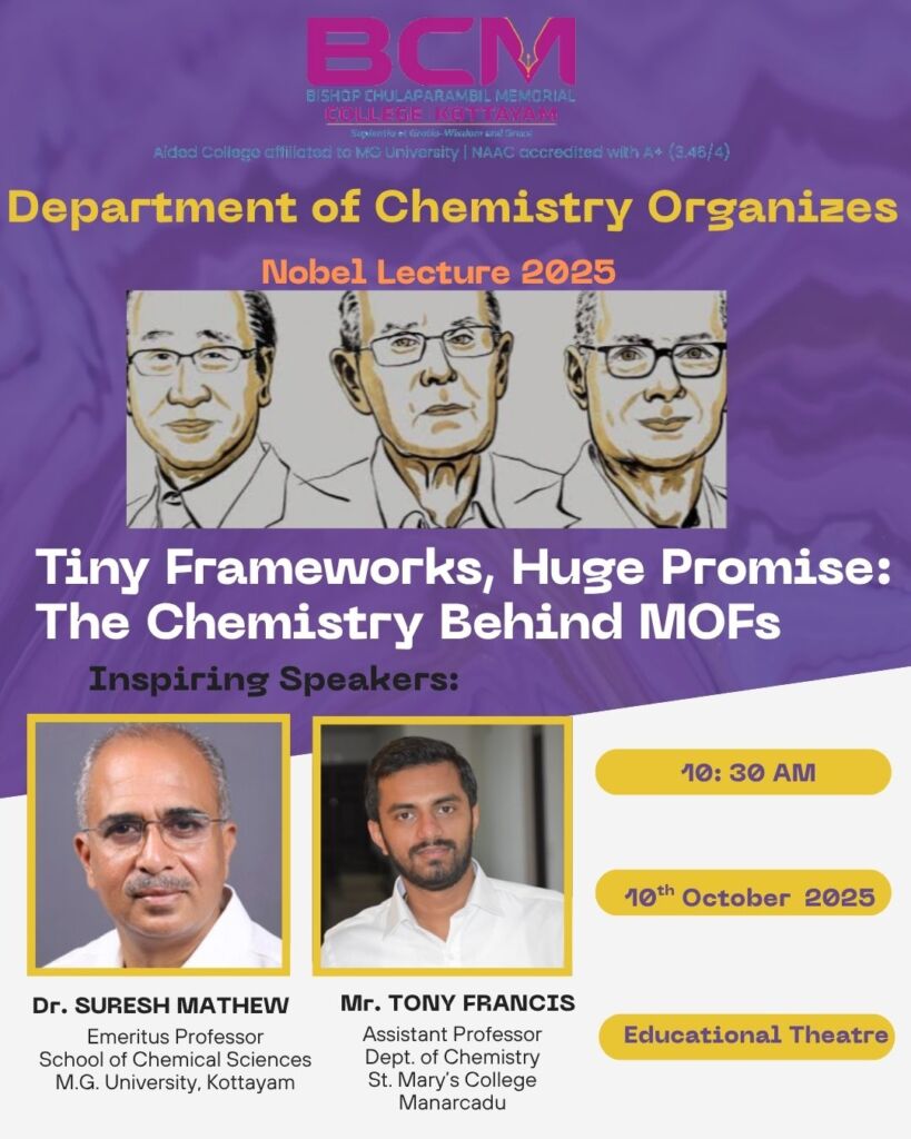 The Department of Chemistry, Bishop Chulaparambil Memorial College, Kottayam, organized the Nobel Laureate Lecture 2025 on October 10, 2025, at the Educational Theatre. The event was themed “Tiny Frameworks, Huge Promise: The Chemistry Behind MOFs”, focusing on the fascinating world of Metal–Organic Frameworks (MOFs), which have revolutionized material chemistry and catalysis in recent years.