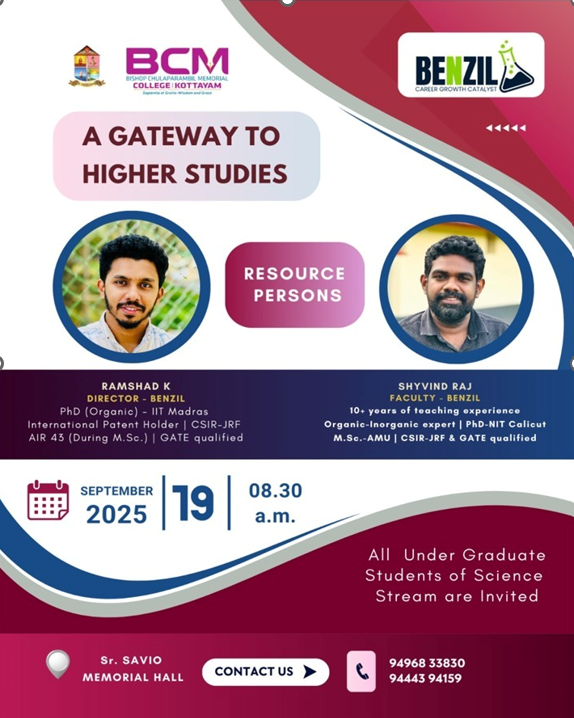 “A Gateway to Higher Studies.” This academic seminar is a collaborative initiative between the Bishop Choolaparambil Memorial College, Kottayam (BCM) and Benzil, an organization focused on professional and academic development. The central objective of this seminar is to furnish undergraduate students of the science stream with critical knowledge and strategic guidance necessary for pursuing advanced academic degrees and research careers.