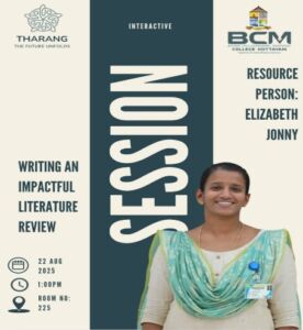 The Department of Commerce organized an insightful session on “Writing an Impactful Literature Review” on 22nd August 2025, led by Dr. Elizabeth Jonny, an expert in academic writing and research methodology. The session helped students understand the purpose, structure, and techniques of preparing an effective literature review, emphasizing critical analysis, proper referencing, and ethical research practices. Overall, the program was highly beneficial, enhancing students’ research skills and motivating them to produce well-organized and impactful academic work.