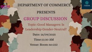 The Department of Commerce, BCM College, Kottayam, in association with Tharang – The Future Leaders’ Forum, organized a Group Discussion on the topic “Good Managers: Is Leadership Gender-Neutral?” on 16th September 2025. The session encouraged students to critically analyze leadership beyond gender, promoting open discussion on inclusivity, skills, and equality in management. Overall, the program was insightful and engaging, helping students enhance their critical thinking, communication, and leadership perspectives.
