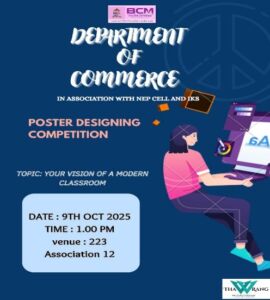 The Department of Commerce of Bishop Chulaparambil Memorial College, Kottayam, in association with the NEP Cell and IKS, conducted a Poster Designing Competition on 9th October 2025 based on the theme “Your Vision of a Modern Classroom.” The event witnessed active participation from students who creatively expressed ideas on innovation, inclusivity, and technology-based learning through their posters. The competition was appreciated by faculty members for encouraging creativity, critical thinking, and a modern perspective on education.