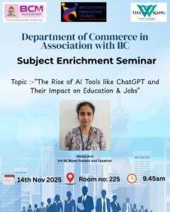 The Department of Commerce, in association with the Institution’s Innovation Council, organized a Subject Enrichment Seminar on the topic “The Rise of AI Tools like Chat GPT and Their Impact on Education & Jobs.” The session, led by Alisha Anil of 3rd DC B.Com Finance and Taxation, was held on 14th November 2025 at 9:45 AM in Room No. 225. The seminar provided valuable insights into how emerging AI technologies are reshaping learning methods and transforming the future job landscape.
