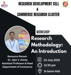 The Research Development Cell and Commerce Research Cluster of BCM College, Kottayam, organized a workshop on “Research Methodology: An Introduction” on 23rd July 2025 at Sr. Savio Hall from 12:30 PM to 2:30 PM. The session was led by Dr. Jipin V. Jimmy, Assistant Professor and Head of the Department of Commerce. The workshop provided students with a clear understanding of the fundamentals of research and encouraged them to adopt a systematic and structured approach to academic inquiry.