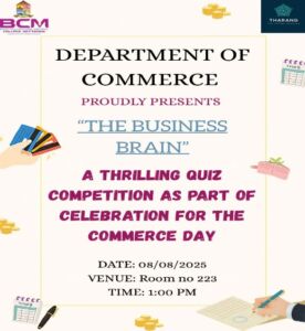 The Department of Commerce organized an interdepartmental Business Quiz Competition titled “The Business Brain” on 8th August 2025 at 1:00 PM in Room No. 223. The event saw enthusiastic participation from various departments, testing students’ knowledge of business, corporate affairs, and current economic trends. It successfully promoted teamwork, quick thinking, and business awareness, making the program both educational and engaging.