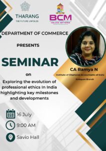 The Department of Commerce, BCM College, Kottayam, under Tharang – The Future Unfolds, organized a seminar on “Exploring the Evolution of Professional Ethics in India” on 16th July 2025 at 9:00 AM in Savio Hall. The session was led by CA. Ramya N from ICAI, Kottayam Branch, who discussed the importance of ethics in the professional world, tracing its evolution and addressing modern challenges in maintaining integrity. The seminar was highly informative and interactive, inspiring students to uphold ethical values as a foundation for professional excellence.