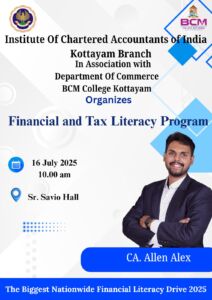 The ICAI, Kottayam Branch, in collaboration with the Department of Commerce, Bishop Chulaparambil Memorial College, conducted a “Financial and Tax Literacy Program” on 16th July 2025 at 10:00 AM in Sr. Savio Hall. The session was led by CA. Allen Alex, who explained key financial concepts like budgeting, saving, investment, and taxation through engaging discussions. As part of the Biggest Nationwide Financial Literacy Drive 2025, the program successfully promoted financial awareness and responsibility among students.