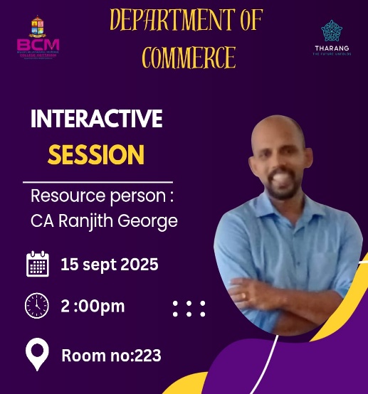 The Department of Commerce, BCM College, Kottayam, organized an interactive session with CA Ranjith George to give students valuable insights into the Chartered Accountancy profession and its career prospects. The session covered key aspects such as the CA course structure, practical training, and essential professional skills, while also motivating students through real-life experiences and guidance. Overall, the program was highly informative and inspiring, helping students gain clarity, confidence, and direction in pursuing a career in finance and accounting.