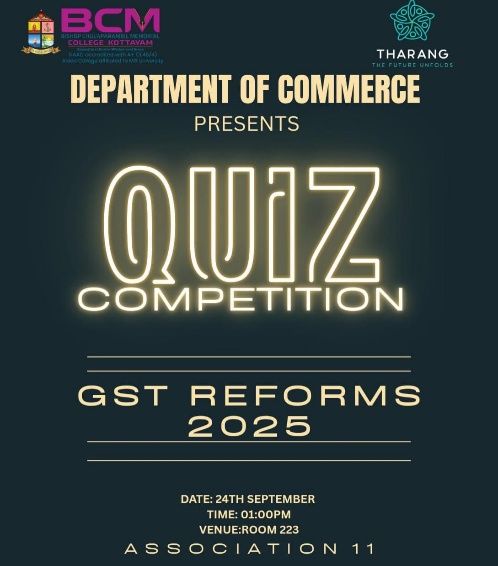 The Department of Commerce of Bishop Chulaparambil Memorial College, Kottayam, under the initiative “Tharang – The Future Unfolds,” organized an enlightening Quiz Competition on “GST Reforms 2025” on 24th September 2025 to enhance students’ understanding of recent taxation developments. The event featured multiple rounds testing participants’ knowledge of GST concepts, reforms, and applications, encouraging analytical thinking and awareness of economic policies. Overall, the competition was a great success, fostering learning, enthusiasm, and real-world insight among commerce students.