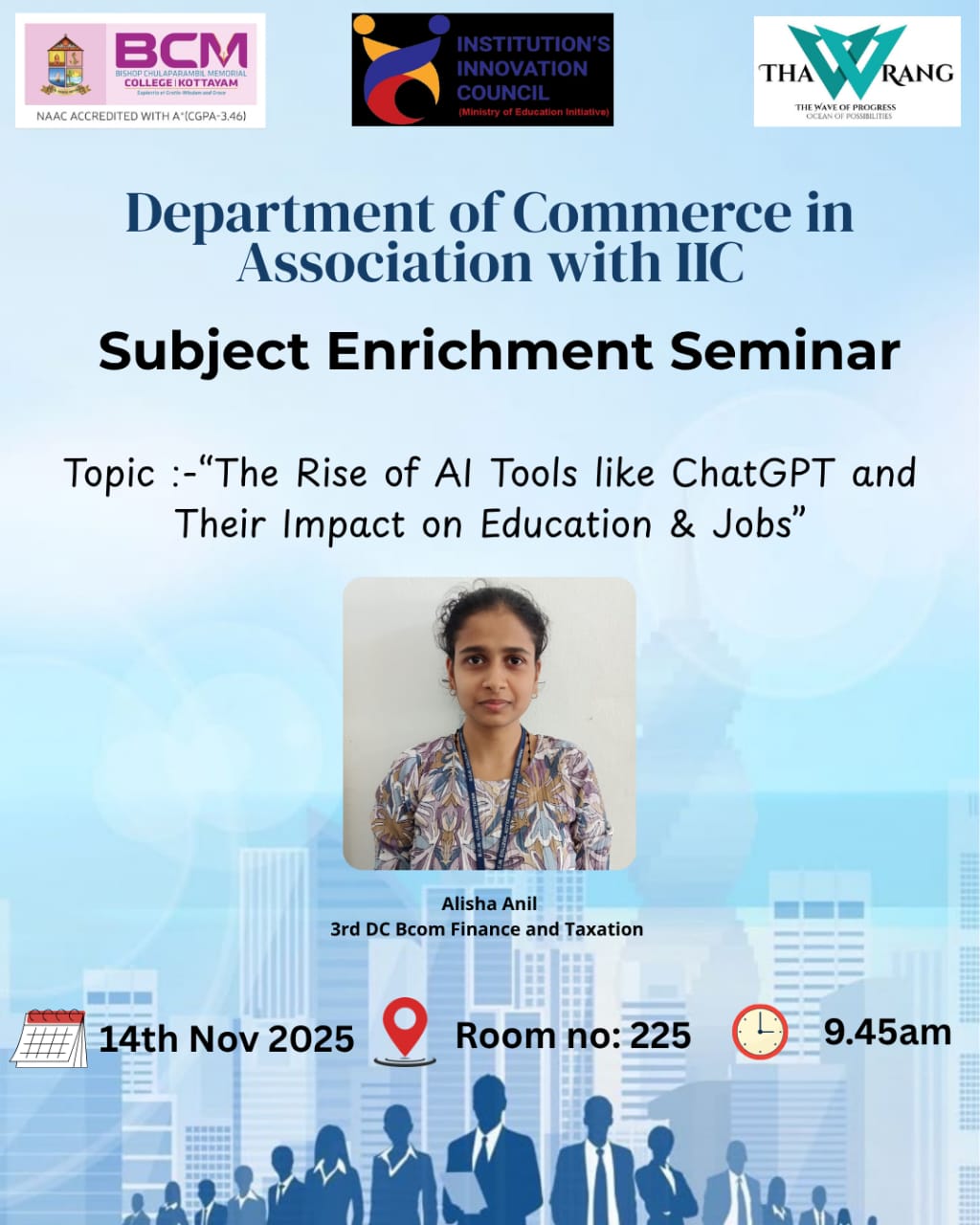 The Department of Commerce, in association with the Institution’s Innovation Council, organized a Subject Enrichment Seminar on the topic “The Rise of AI Tools like Chat GPT and Their Impact on Education & Jobs.” The session, led by Alisha Anil of 3rd DC B.Com Finance and Taxation, was held on 14th November 2025 at 9:45 AM in Room No. 225. The seminar provided valuable insights into how emerging AI technologies are reshaping learning methods and transforming the future job landscape.