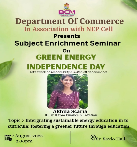 The Department of Commerce, in association with the NEP Cell of BCM College, Kottayam, organized a Subject Enrichment Seminar on the theme “Green Energy Independence Day” on 7th August 2025 at 2:00 PM in Sr. Savio Hall. The session featured Akhila Scaria, a student of III DC B.Com Finance and Taxation, who spoke on integrating sustainable energy education into curricula to promote environmental responsibility. The seminar effectively raised awareness about renewable energy, encouraging students to adopt eco-friendly practices and contribute to a sustainable future.