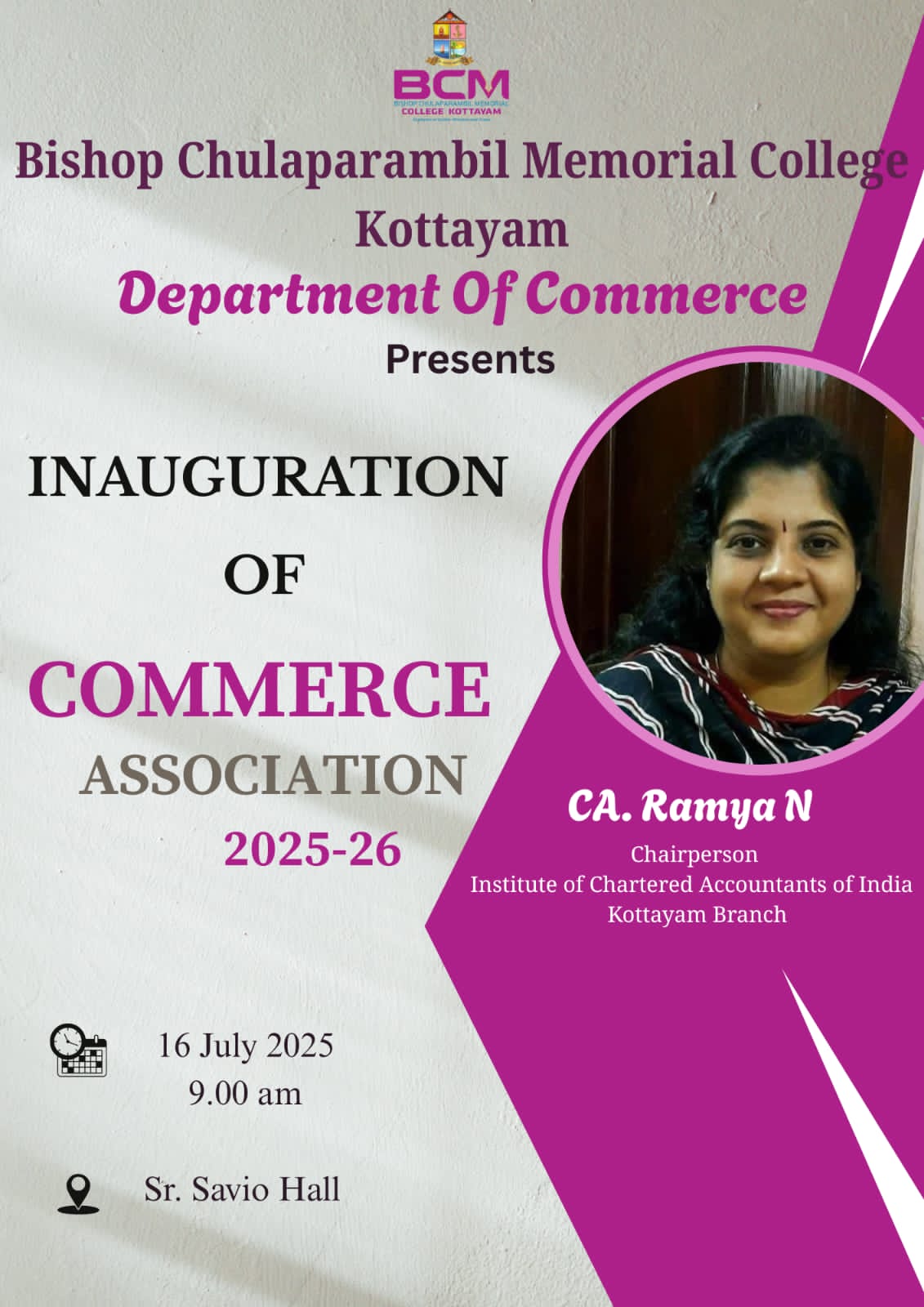 The Department of Commerce at Bishop Chulaparambil Memorial College, Kottayam, inaugurated its Commerce Association 2025–26, titled “THARANG – The Future Unfolds,” on 16th July 2025 at 9:00 AM in Sr. Savio Hall. The event, inaugurated by CA. Ramya N, Chairperson of ICAI, Kottayam Branch, emphasized the importance of ethics, innovation, and continuous learning in commerce. The unveiling of the logo and tagline marked a new beginning, aiming to inspire students through seminars, workshops, and leadership activities.