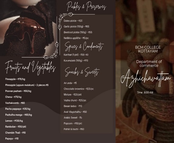 The Department of Commerce of BCM College, Kottayam, organized Azhichavattam with great enthusiasm, showcasing a variety of homemade, handcrafted, and eco-friendly products that celebrated sustainability and creativity. The event featured diverse stalls, including fruits and vegetables, pickles, snacks, crafts, and beauty services, reflecting Kerala’s rich culture and entrepreneurial spirit. Overall, the program was a vibrant success, promoting tradition, teamwork, and sustainable living among students.