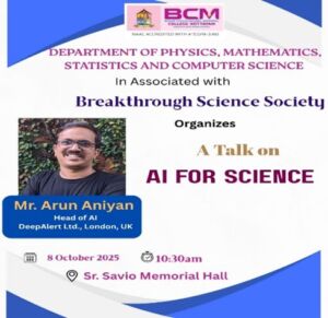 This program features an expert talk titled “AI for Science”, aimed at introducing students and faculty to the growing role of Artificial Intelligence in scientific research and innovation. Organized by the Department of Physics, Mathematics, Statistics and Computer Science of BCM College Kottayam in collaboration with the Breakthrough Science Society.