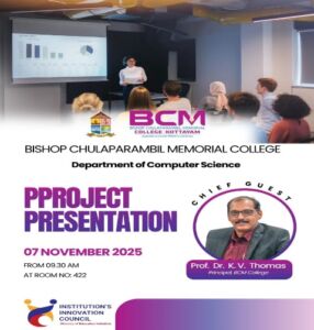 This program is a Project Presentation organized by the Department of Computer Science at Bishop Chulaparambil Memorial College. It provides students an opportunity to present their academic projects, showcase innovative ideas, and develop their communication and technical skills. The event aims to encourage creativity, teamwork, and critical thinking while offering a platform for students to receive feedback and improve their project work.