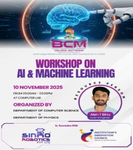 This program is a Workshop on AI & Machine Learning organized by the Department of Computer Science and the Department of Physics at BCM College Kottayam. Conducted in association with Sinro Robotics Pvt. Ltd. And the Institution’s Innovation Council, the workshop aims to give participants a practical introduction to Artificial Intelligence and Machine Learning, covering fundamental concepts, real-world applications, and hands-on learning experiences.
